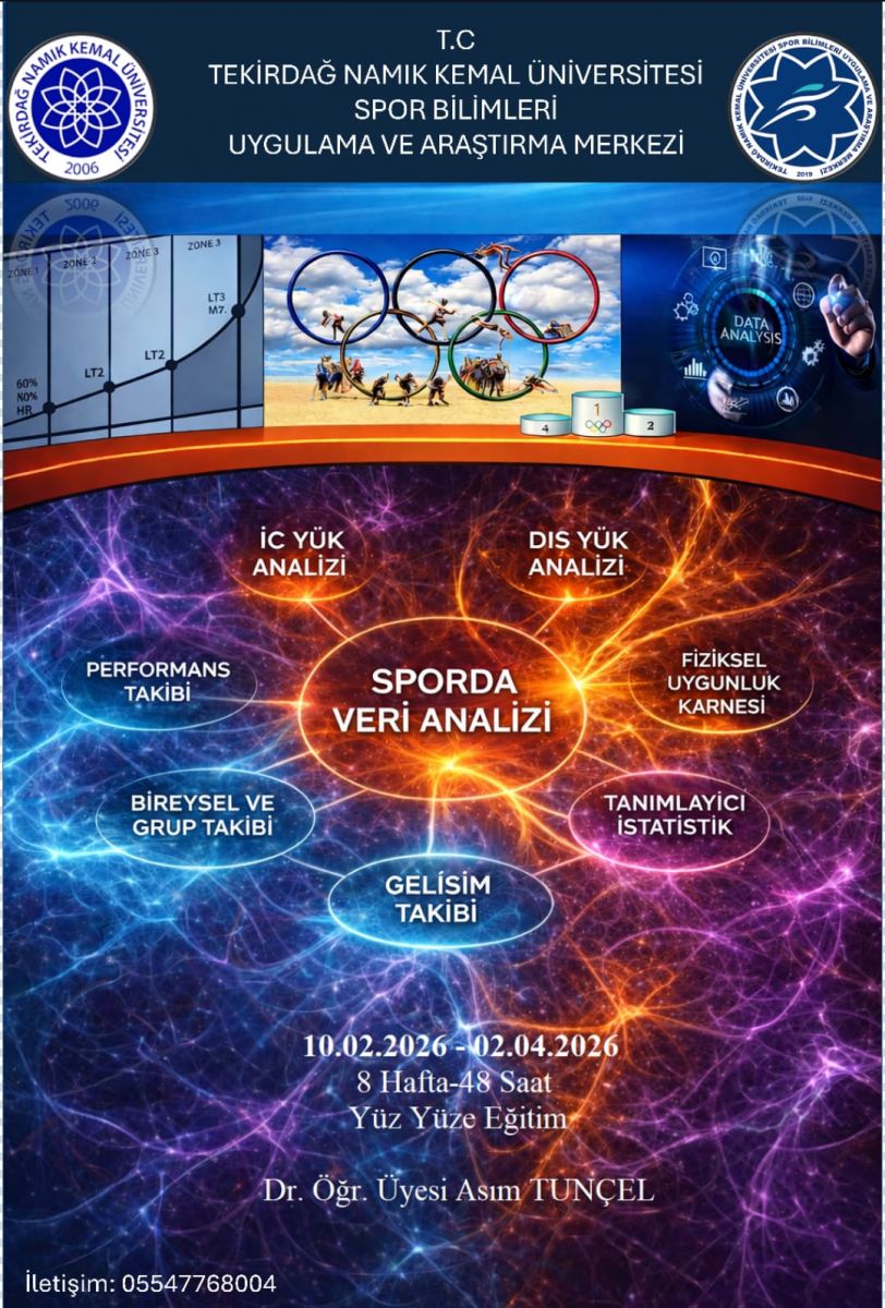 Tekirdağ NKÜ Spor Bilimleri Uygulama ve Araştırma Merkezi bünyesinde, Spor Bilimleri alanında uygulanan fiziksel uygunluk ve performans testlerinin analiz edilmesi, yorumlanması, izlenmesi ve raporlanması süreçlerinde katılımcıların veri analizi bilgi ve becerilerini geliştirmeye yönelik olarak "Sporda Veri Analizi" kursu açılacaktır.